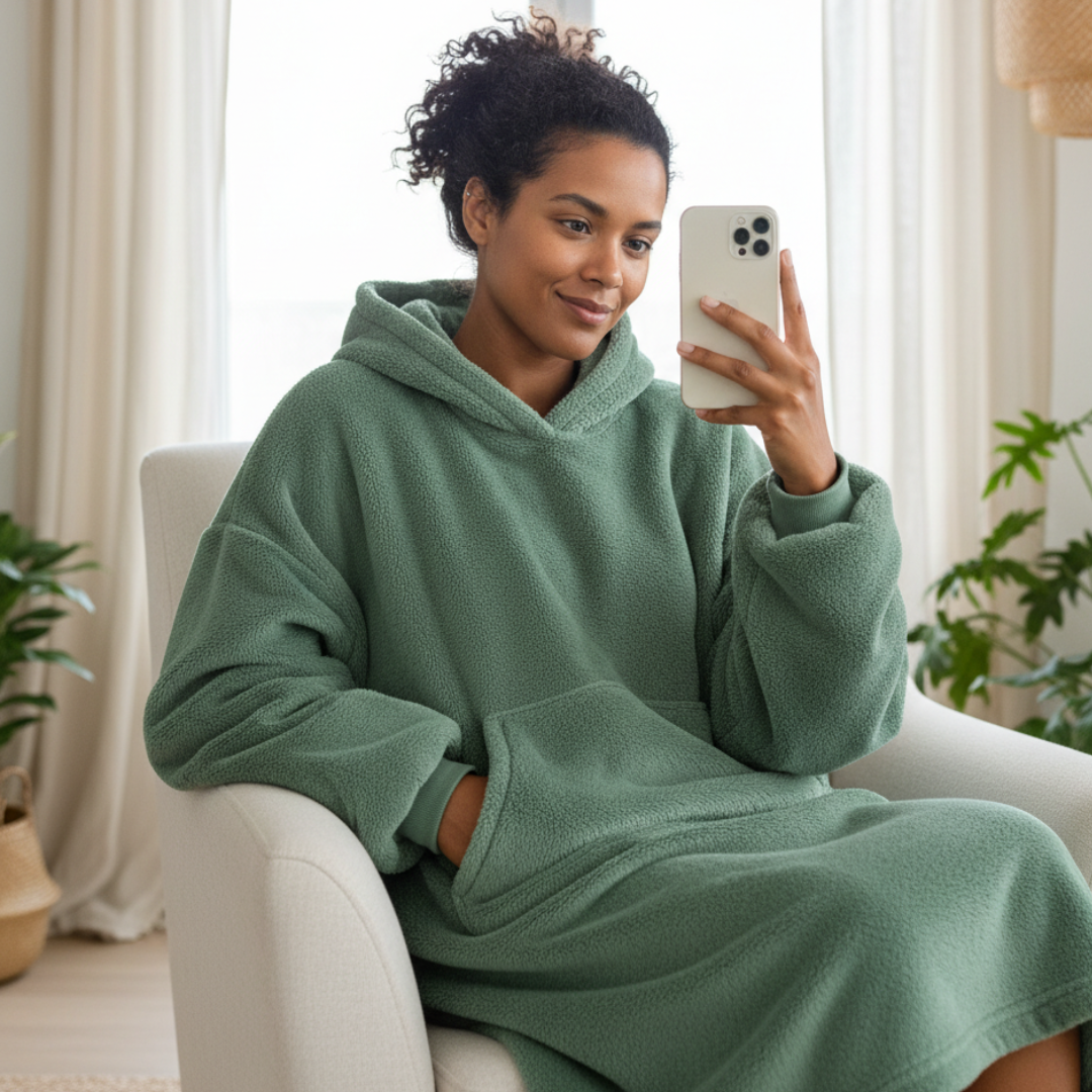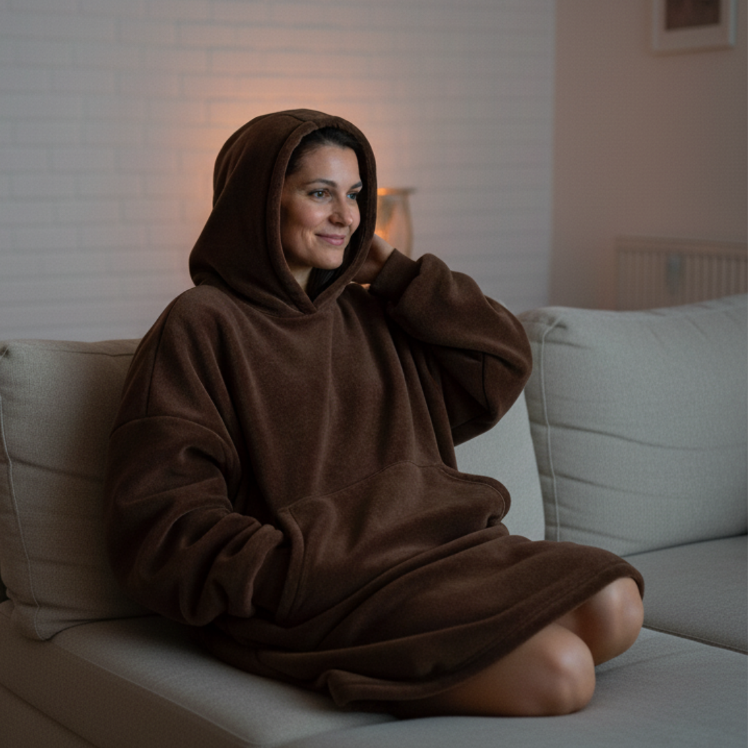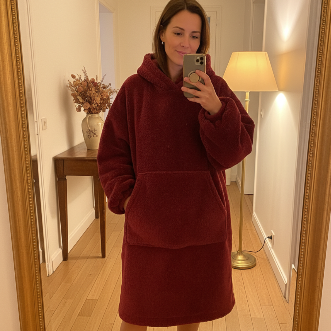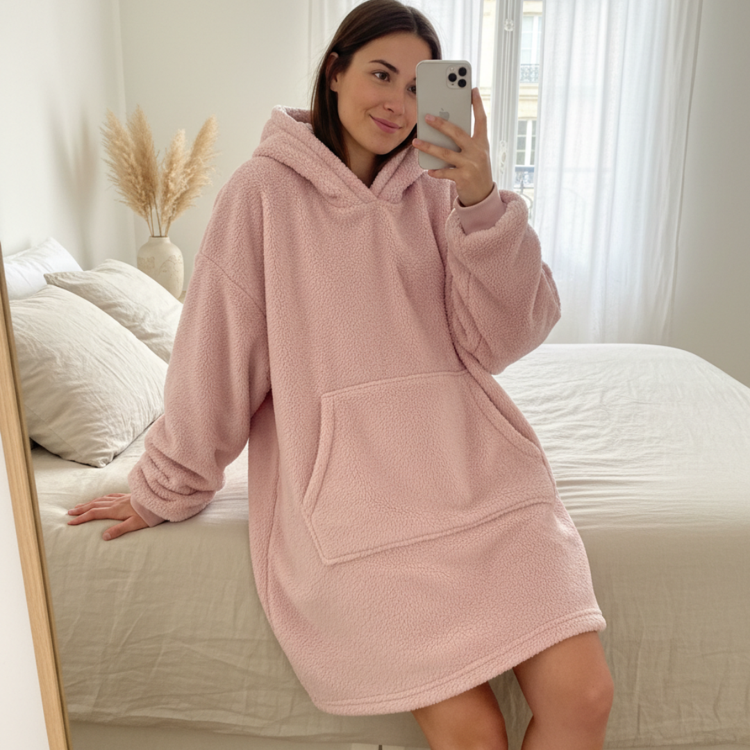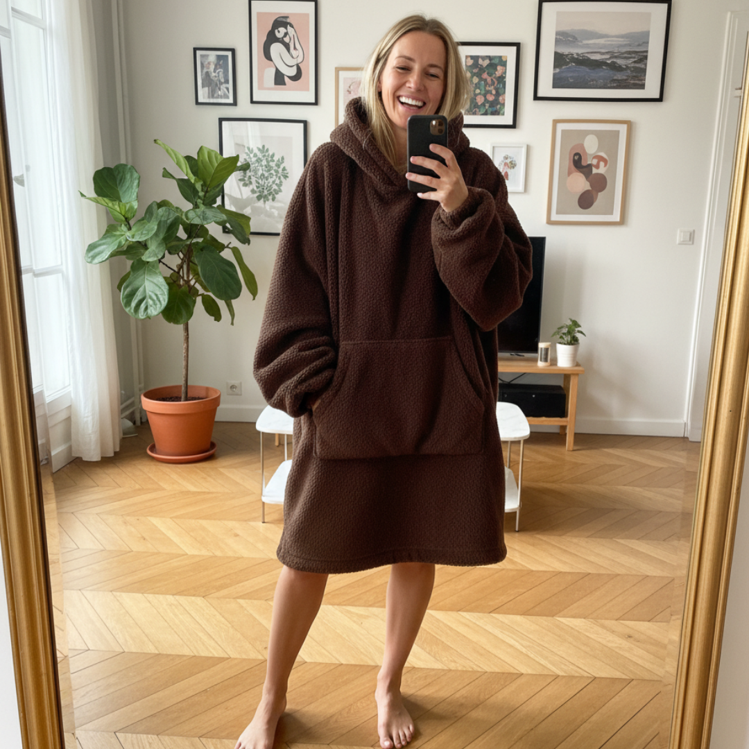 La coupe oversize est très confortable. Idéal pour regarder des films ou télétravailler confortablement. Un achat utile et confortable. Pratique pour garder les mains au chaud grâce à la grande poche.